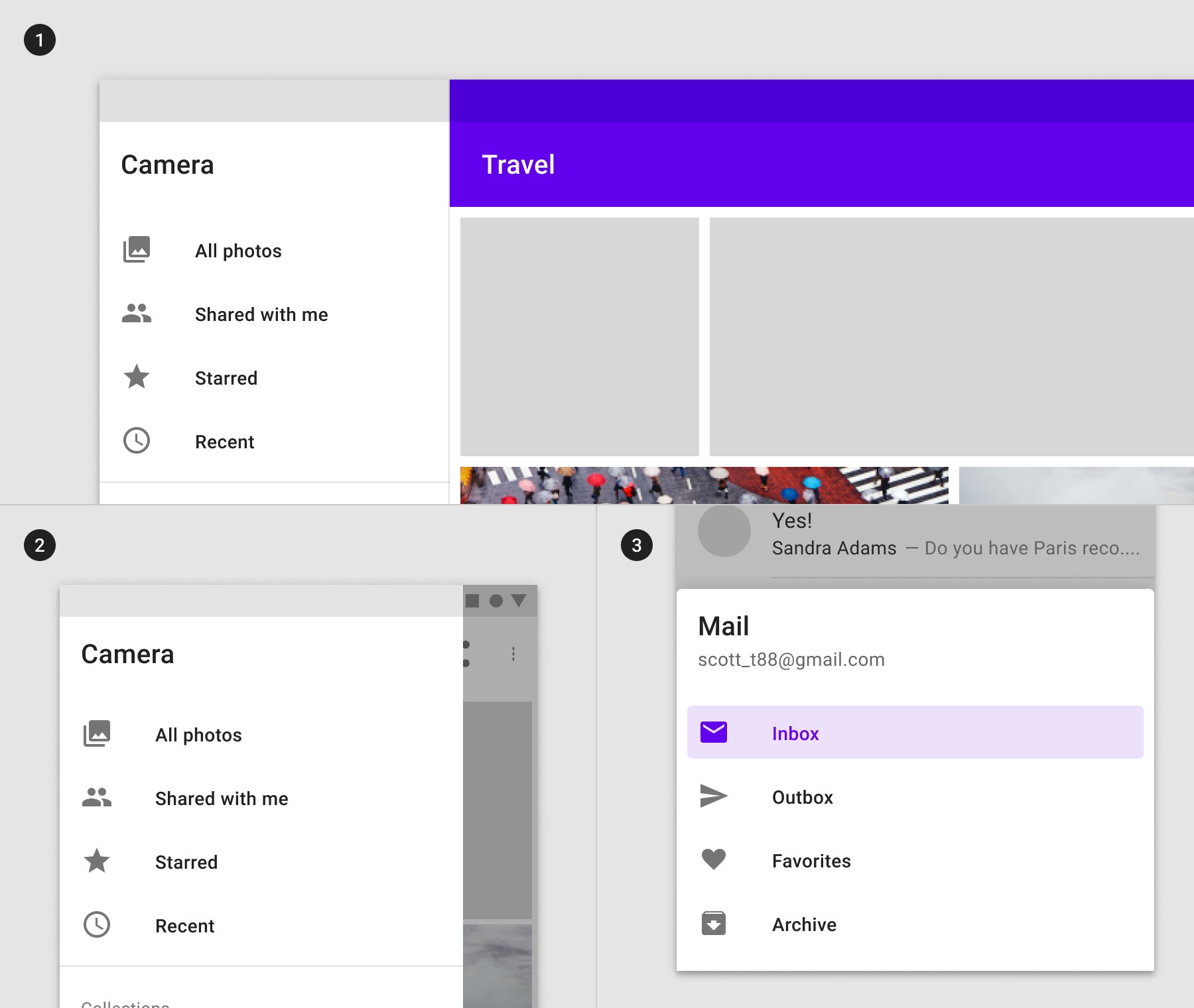 There are three types of navigation drawers: standard (1), modal (2), and bottom (3).