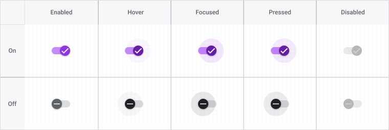 Switches can be on or off. Switches have enabled, hover, focused, and pressed states.